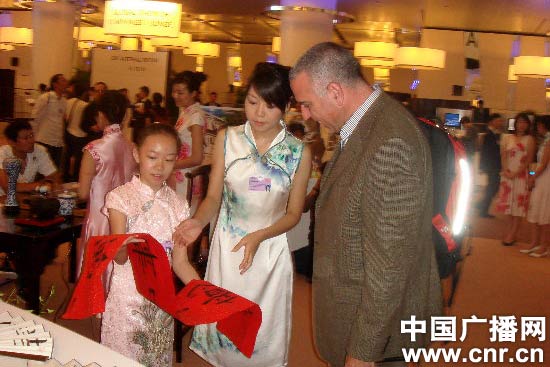 天津11歲小學(xué)生王灝融將現(xiàn)場書寫的書法作品送給外賓朋友(中廣網(wǎng)記者王嘉軍 攝)