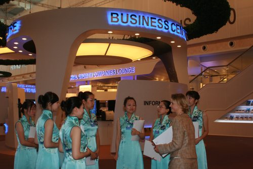 2010夏季達(dá)沃斯(新領(lǐng)軍者年會(huì))9月13-9月15日在天津舉辦,主題為“推動(dòng)可持續(xù)增長(zhǎng)”。作為夏季達(dá)沃斯官方網(wǎng)絡(luò)媒體合作伙伴和官方互動(dòng)平臺(tái),騰訊財(cái)經(jīng)對(duì)本次論壇進(jìn)行全程網(wǎng)絡(luò)直播。圖為達(dá)沃斯新領(lǐng)軍者村內(nèi),禮儀小姐正在接受領(lǐng)隊(duì)培訓(xùn)。