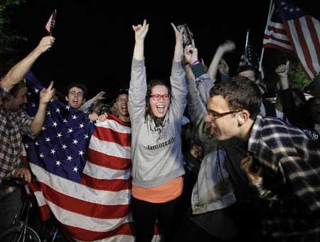 而在美國首都華盛頓,不少人聚集在白宮前舉行慶;顒,高喊“美國!美國!”的口號,同時揮舞美國國旗。