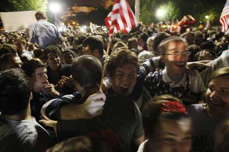 據(jù)美國媒體報道,美國總統(tǒng)奧巴馬宣布基地組織頭目本·拉丹被擊斃的消息后,美國許多民眾在5月2日凌晨自發(fā)舉行了慶;顒。