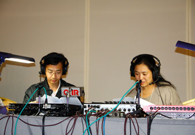 技術(shù)中心周俊生給經(jīng)濟(jì)之聲記者黃耀偉戴監(jiān)聽(tīng)耳機(jī)