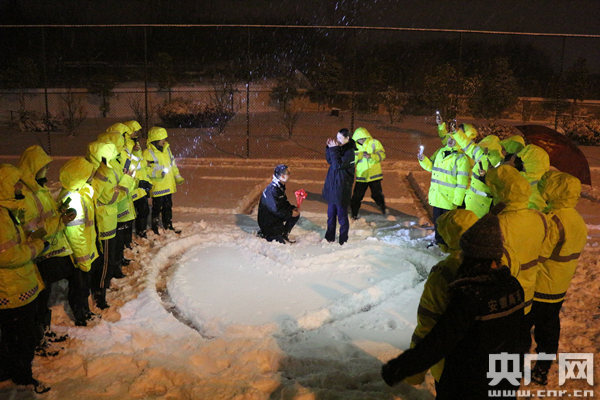 1月25日晚19時(shí)許,一名員工把魯亞萍“騙”到現(xiàn)場,面對(duì)此情此景和單膝下跪遞上“鮮花”的小查,小魯感動(dòng)地?zé)釡I盈眶。兩人在風(fēng)雪中相擁,眾人舉起手機(jī)拍下視頻和照片為他們歡呼喝彩。隨后,眾人將視頻和照片轉(zhuǎn)發(fā)至中心微信群,贏得了更多的祝福與點(diǎn)贊。簡短的儀式后,全員又重新回到緊張的鏟冰除雪工作中。