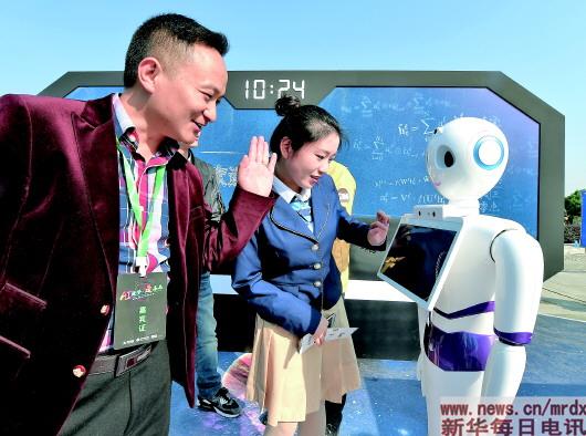 在安徽合肥開幕的科大訊飛(首屆)全球1024開發(fā)者節(jié)展示區(qū)內(nèi),參觀者和智能語音機(jī)器人進(jìn)行互動(2017年10月24日攝)。 新華社資料片