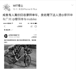 近日,有網(wǎng)友在微博爆料稱,摩拜等共享單車的出售信息出現(xiàn)在一些二手車平臺上,一輛摩拜的價格在2000元左右。在某二手交易平臺上,還有人出價2000元回收摩拜單車。記者在網(wǎng)友發(fā)的截圖上看到,“2000元高價回收摩拜自行車”,條件是“需拆除GPS”。