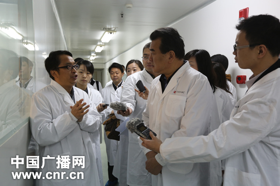 中央人民廣播電臺(tái)“走轉(zhuǎn)改”系列報(bào)道《傾聽北京 》采訪團(tuán)17日來到北京科興控股生物技術(shù)有限公司。圖為由王求臺(tái)長(zhǎng)(右二)率領(lǐng)的采訪團(tuán)在了解北京科興的疫苗生產(chǎn)設(shè)備。(記者 涂傲/攝)