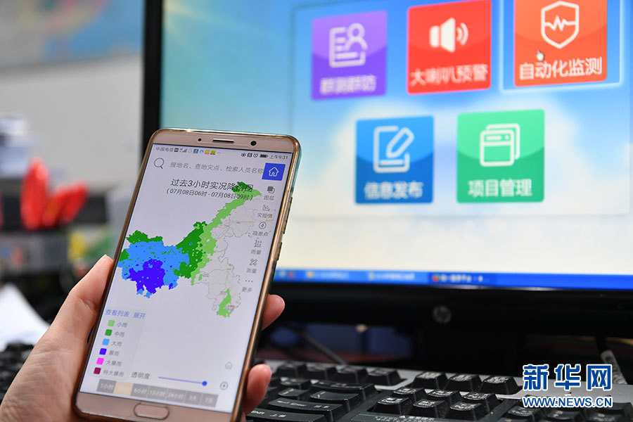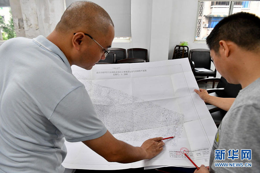 陳良斌、魏德勇、黃荀、向青松是重慶市南岸區(qū)僅有的四名地質(zhì)“體檢師”,每天上班的第一件事,便是通過手機(jī)查看當(dāng)?shù)氐慕涤昵闆r。同時(shí),通過監(jiān)測系統(tǒng),了解當(dāng)?shù)刈钚碌娘L(fēng)險(xiǎn)走向。新華網(wǎng)發(fā)(郭旭 攝)