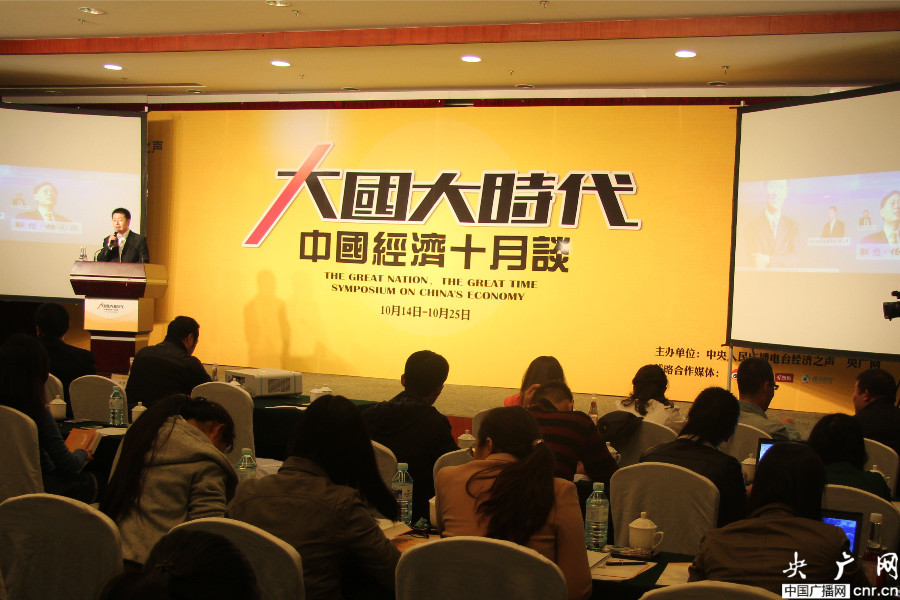 10月22日,由中央人民廣播電臺經(jīng)濟之聲、央廣網(wǎng)主辦的《大國大時代----中國經(jīng)濟十月談》系列時事報告會之六“農(nóng)村談”,在廣電國際酒店舉行。今天的主題是《農(nóng)村談:農(nóng)民與土地是歷史性地說再見了嗎?》。圖為報告會現(xiàn)場(央廣網(wǎng) 于琦/攝)