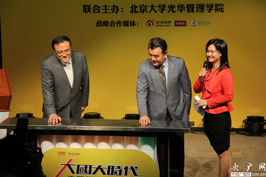 中央人民廣播電臺(tái)臺(tái)長(zhǎng)王求(左二)和北京大學(xué)光華學(xué)院黨委書記冒大衛(wèi)(左一)共同啟動(dòng)《大國(guó)大時(shí)代》(央廣網(wǎng) 李雪南 攝)