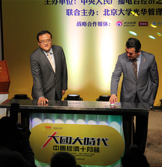 央廣網(wǎng)財(cái)經(jīng)北京10月14日消息 由中央人民廣播電臺(tái)經(jīng)濟(jì)之聲、央廣網(wǎng)財(cái)經(jīng)主辦的《大國大時(shí)代----中國經(jīng)濟(jì)十月談》系列時(shí)事報(bào)告會(huì),10月14日在北京大學(xué)啟動(dòng),中央人民廣播電臺(tái)臺(tái)長王求和北京大學(xué)光華學(xué)院黨委書記冒大衛(wèi)先生共同按下啟動(dòng)按鈕,正式拉開這次系列時(shí)事報(bào)告會(huì)序幕。
