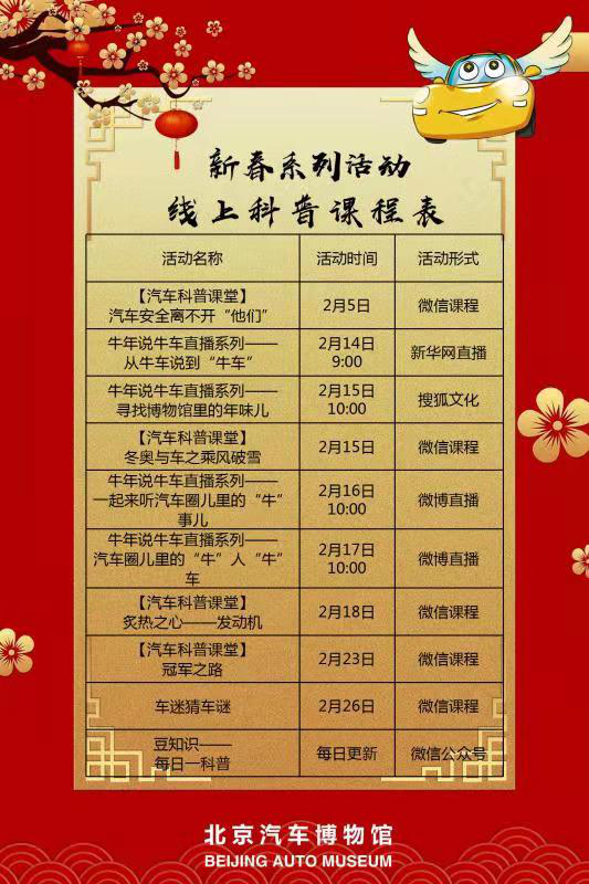 據(jù)北京汽車博物館相關(guān)負(fù)責(zé)人介紹,初三至初六以“牛年說(shuō)牛車”為主題,每天一場(chǎng)直播講述汽車圈兒里的“!避、牛人、牛事兒。初三,科普老師講帶領(lǐng)大家從古代的牛車講到現(xiàn)在的“!避嚕怀跛,汽車博物館工作人員將帶領(lǐng)大家尋找汽博館里的年味兒,逛一逛博物館里的新春文創(chuàng)節(jié);初五,講解員以角色扮演的方式為大家?guī)?lái)一場(chǎng)情景式講解;初六,以新年特展“那些年,在路上”為主線帶大家看一看各個(gè)年代的經(jīng)典車型,聊一聊汽車圈兒里的“!比恕芭!笔聝。