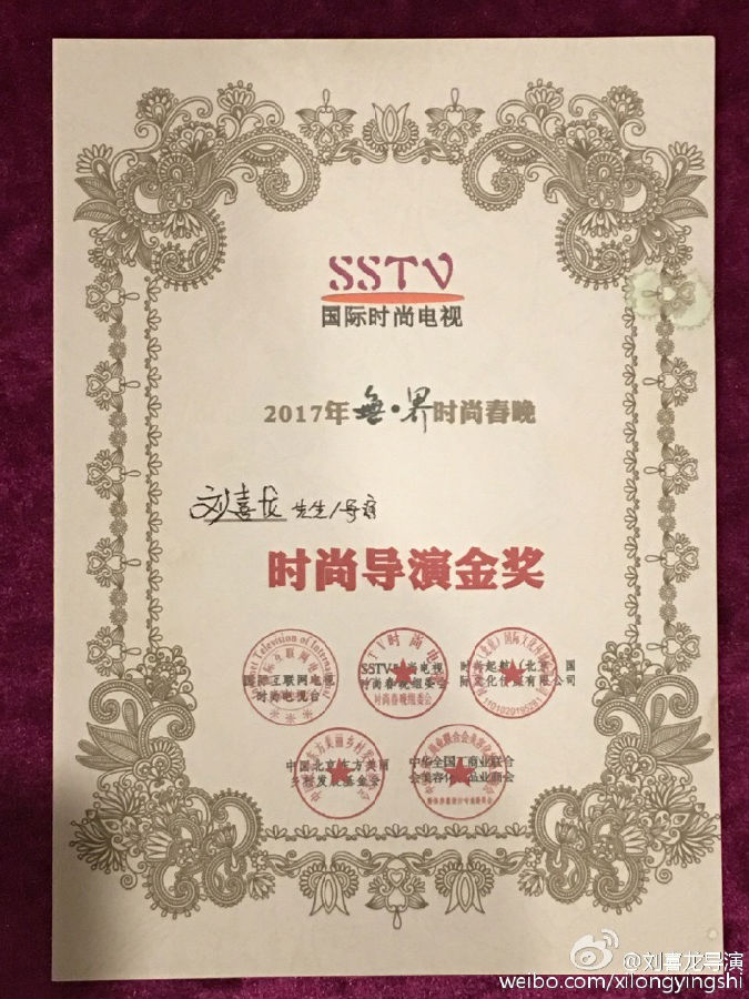 近日,劉喜龍導(dǎo)演榮獲SSTV時尚電視臺時尚導(dǎo)演金獎,據(jù)悉,時尚電視臺是以電視、電腦、手機為終端,利用三網(wǎng)融合技術(shù)打造出來的網(wǎng)絡(luò)電視公共服務(wù)平臺。旨在定制多樣性、全方位的網(wǎng)絡(luò)試聽互動服務(wù),讓公眾擁有多元化的信息渠道將世界各國各地區(qū)互聯(lián)互通,劉喜龍導(dǎo)演已經(jīng)連續(xù)兩屆參與指導(dǎo)時尚電視臺時尚春晚。