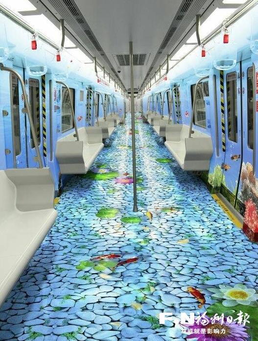 微博博主“福州地鐵迷”發(fā)布了幾張地鐵列車內(nèi)的照片,并配文:“福州地鐵新彩繪車廂出爐,這次以清新靈動(dòng)為創(chuàng)意主線,主題為金魚(yú),小鐵感覺(jué),仿佛到了水族館!痹3張照片中,記者看到,車廂兩側(cè)整體為藍(lán)色調(diào),腳下“鋪滿”鵝卵石,多尾形態(tài)、顏色各異的金魚(yú)在水草間歡快游動(dòng)。
