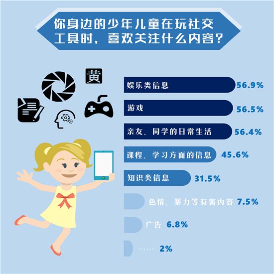 調(diào)查中,7.5%的受訪者發(fā)現(xiàn)有兒童在瀏覽網(wǎng)絡(luò)社交工具中的色情、暴力等有害內(nèi)容,6.8%的受訪者發(fā)現(xiàn)有兒童愛看網(wǎng)絡(luò)社交工具上的廣告。