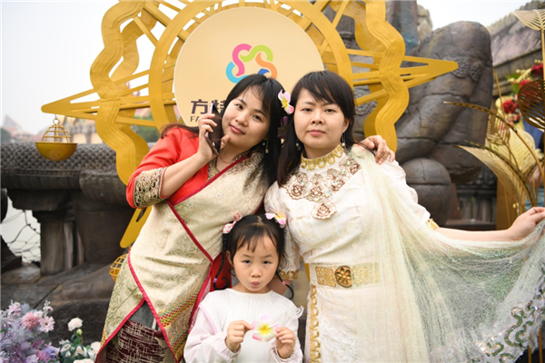 游客身穿特色服飾合影(央廣網(wǎng)發(fā) 南寧方特東盟神畫主題樂園供圖)