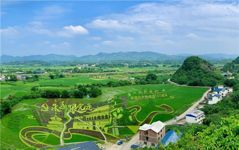 這是馬安村慶祝中國共產(chǎn)黨成立100周年的獻(xiàn)禮之作,以大地為畫布,用水稻為顏料,在以綠色為主基調(diào)的田野中,將褐、黃、綠不同顏色的水稻,拼湊成建黨100周年標(biāo)識、北京天安門圖案、和平鴿等不同形態(tài)的圖案,勾勒出一幅唯美動人的“田園山水畫”,成為“美麗鄉(xiāng)村”的一道特色風(fēng)景。