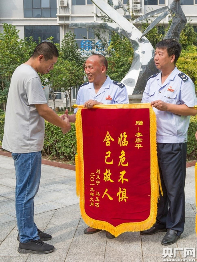 李彥平(中)接受獲救孩子父親贈(zèng)送的錦旗(央廣網(wǎng)發(fā) 通訊員徐國(guó)良 攝)