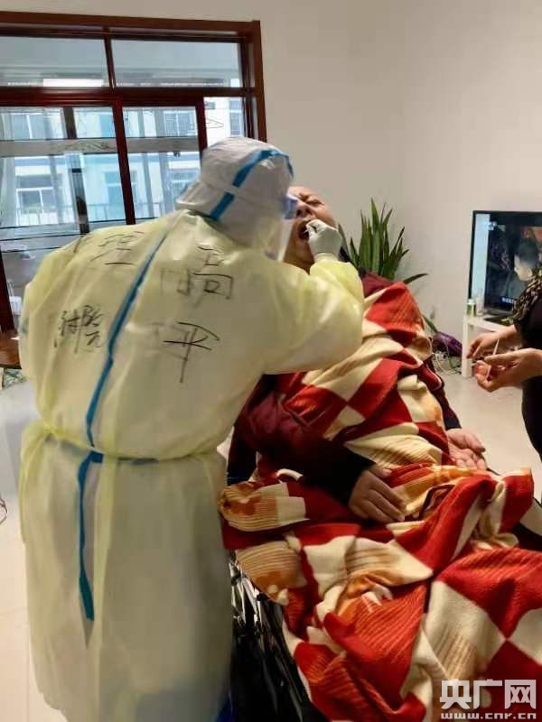 有村民提出申請,因?yàn)槔先诵袆硬槐悴荒芟萝,能否請工作人員到小學(xué)門口為其親人采集標(biāo)本。聽到請求,部媛媛和王鳳玲二話沒說走向前去。部媛媛身穿防護(hù)服,半蹲著笨重的身軀幾乎探進(jìn)車窗內(nèi)為老人進(jìn)行采集。隨著輕柔的聲音“大爺張嘴”,動作快速且輕柔,標(biāo)本采集完畢,王鳳玲立即裝袋,消毒動作一氣呵成,周圍群眾豎起了大拇指。