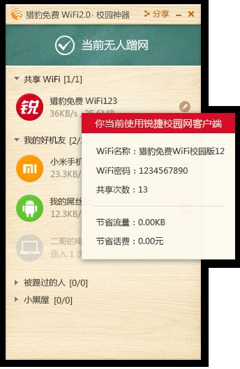 學生只要安裝運行獵豹免費WiFi2.0-校園神器,就能將電腦瞬間變成免費WiFi,從而讓手機、PAD等無線設備免費上網。而且,一個寢室的同學不用每人都辦理校園網套餐,可以共享同一校園網賬號,從而幫助學生減輕經濟負擔。
