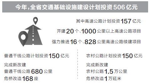 今年,全省交通基礎(chǔ)設(shè)施建設(shè)計劃投資506億元,其中高速公路計劃投資157億元。強力推進(jìn)16個、828公里高速公路續(xù)建項目。普通干線公路計劃投資150億元,重點實施低等級公路升級改造、城鎮(zhèn)過境段建設(shè),完成新改建普通干線公路680公里,危橋改造168座;農(nóng)村公路計劃投資150億元,完成新改建農(nóng)村公路1.5萬公里,危橋改造1萬延米。(記者 董娉)