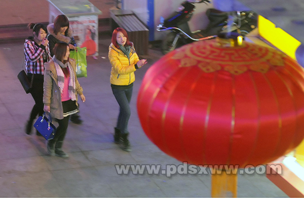 1月14日晚,平頂山市區(qū)和平路步行街,靚麗的女孩們從燈籠下走過。
