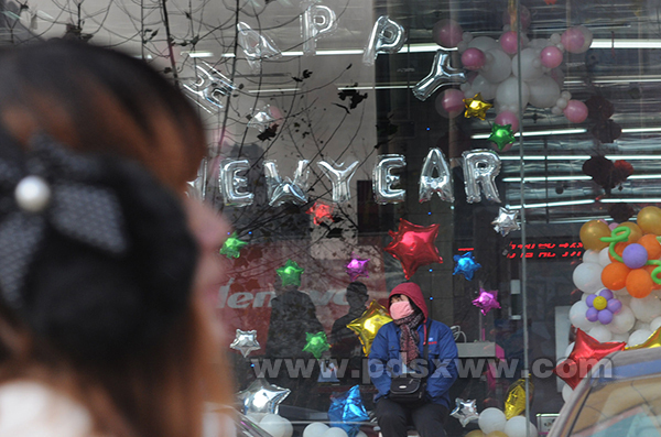 1月11日,平頂山市區(qū)中興路,女孩從布滿“新年快樂”英文字母的商場門前經(jīng)過。