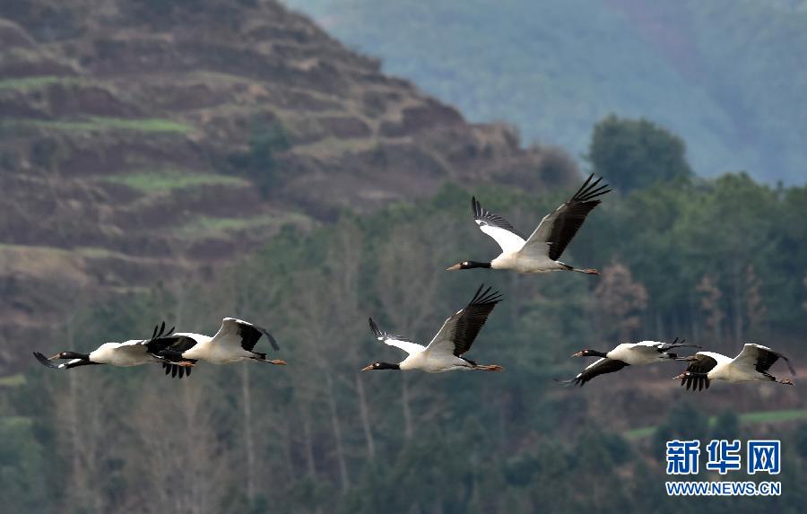 黑頸鶴在念湖上空飛翔(2月1日攝)。