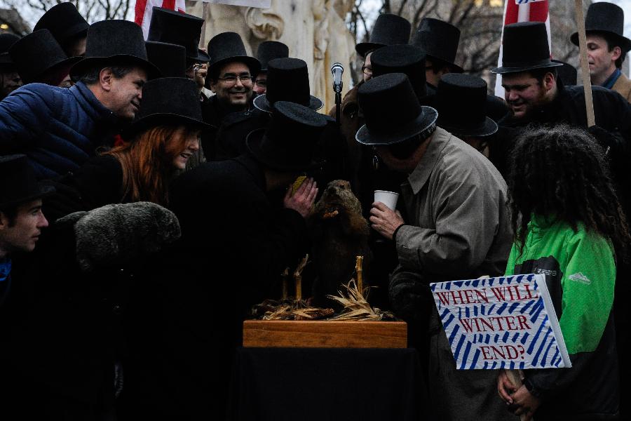 央廣網(wǎng)河南分網(wǎng)消息 2月2日,在美國首都華盛頓,人們圍繞在該地區(qū)的土撥鼠波托馬克·菲爾旁,“聆聽”它的預(yù)測(cè)。波托馬克·菲爾是一個(gè)土撥鼠模型。每年的2月2日是北美地區(qū)的傳統(tǒng)節(jié)日“土拔鼠日”。根據(jù)傳說,如果土撥鼠從洞穴里爬出后能看到自己的影子,當(dāng)?shù)厝司蜁?huì)相信冬天至少還有六周才會(huì)結(jié)束。根據(jù)土撥鼠日官方網(wǎng)站發(fā)布的消息,美國最著名的“天氣預(yù)測(cè)專家”、來自賓夕法尼亞州的土撥鼠“菲爾”2日晨出洞后看到了自己的影子,預(yù)測(cè)美國至少還要忍受六周的寒冷冬日。新華社記者鮑丹丹攝