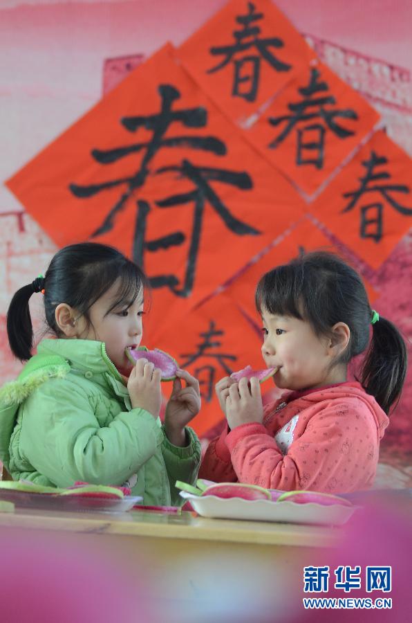 2月3日,在山東省沂源縣一家幼兒園,小朋友在吃蘿卜“咬春”。