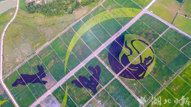 8月9日,一個(gè)直徑約200米的“嫦娥”圖案出現(xiàn)在咸寧市咸安區(qū)高橋鎮(zhèn)的稻田里。 咸安區(qū)是嫦娥文化之鄉(xiāng),湖北文化旅游投資集團(tuán)有限公司在當(dāng)?shù)亟ㄔO(shè)田園綜合體項(xiàng)目,打造白水畈美麗村灣。這個(gè)占地400多畝的七彩稻田景點(diǎn),栽種彩色水稻、巨型稻等特殊品種并拼成圖案,是首個(gè)完工的項(xiàng)目。