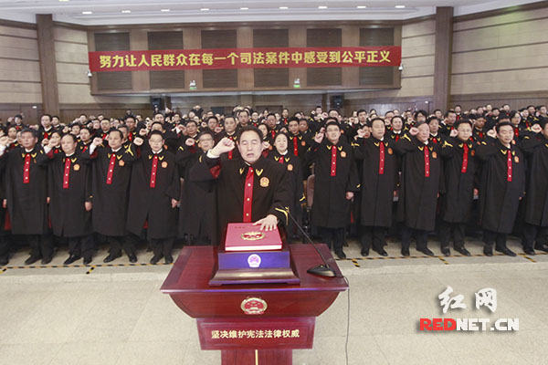 紅網(wǎng)長沙3月31日訊(時刻新聞記者 鄭濤 通訊員 曾妍)3月31日,湖南省人大常委會對省法院首批入額法官進(jìn)行報備或任命后,湖南高院即舉行了首批入額法官暨新任審判員宣誓儀式。湖南高院和長沙、衡陽、懷化三個鐵路運輸法院共230名員額法官向憲法莊嚴(yán)宣誓。省人大常委會副主任、省法官檢察官遴選委員會主任謝勇監(jiān)誓并講話,湖南高院黨組書記、院長康為民主持宣誓儀式。