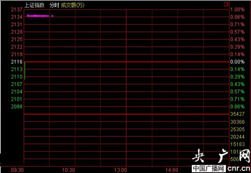 央廣網(wǎng)財(cái)經(jīng)北京1月2日消息 今日是2014年首個(gè)交易日,滬深兩市早盤低開,截至開盤,滬指低開0.18%,報(bào)2112.13點(diǎn),深成指低開0.47%,報(bào)8083.77點(diǎn),創(chuàng)業(yè)板低開0.16%,報(bào)1302.30點(diǎn)。