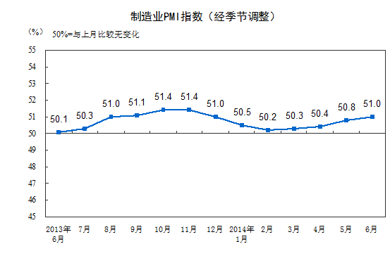2014年6月,中國制造業(yè)采購經(jīng)理指數(shù)(PMI)為51.0%,比上月上升0.2個百分點,連續(xù)4個月回升,表明制造業(yè)延續(xù)了平穩(wěn)增長的良好勢頭。