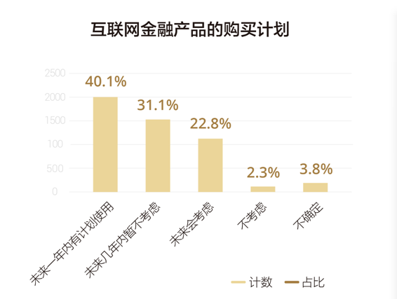在互聯(lián)網(wǎng)金融深入千家萬戶的潮流之下,調(diào)查發(fā)現(xiàn):在未來一年內(nèi),有多達(dá)40.06%的大學(xué)生有意愿購買互聯(lián)網(wǎng)金融(服務(wù))。還有22.75%的大學(xué)生選擇了“未來,等互聯(lián)網(wǎng)發(fā)展成熟之后,會(huì)考慮使用互聯(lián)網(wǎng)金融產(chǎn)品(服務(wù))”。