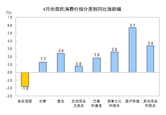 4 月份,食品煙酒價(jià)格同比下降 1.8% ,影響 CPI 下降約 0.56 個(gè)百分點(diǎn)。其中,鮮菜價(jià)格下降 21.6% ,影響 CPI 下降約 0.65 個(gè)百分點(diǎn);蛋價(jià)格下降 11.4% ,影響 CPI 下降約 0.07 個(gè)百分點(diǎn);畜肉類(lèi)價(jià)格下降 4.6% ,影響 CPI 下降約 0.23 個(gè)百分點(diǎn)(豬肉價(jià)格下降 8.1% ,影響 CPI 下降約 0.24 個(gè)百分點(diǎn));水產(chǎn)品價(jià)格上漲 5.9% ,影響 CPI 上漲約 0.11 個(gè)百分點(diǎn);鮮果價(jià)格上漲 5.9% ,影響 CPI 上漲約 0.10 個(gè)百分點(diǎn);糧食價(jià)格上漲 1.5% ,影響 CPI 上漲約 0.03 個(gè)百分點(diǎn)。