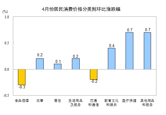4 月份,全國(guó)居民消費(fèi)價(jià)格總水平環(huán)比上漲 0.1% 。其中,城市上漲 0.1% ,農(nóng)村持平;食品價(jià)格下降 0.6% ,非食品價(jià)格上漲 0.2% ;消費(fèi)品價(jià)格下降 0.1% ,服務(wù)價(jià)格上漲 0.4% 。
