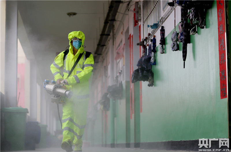 2020年3月26日,江西省吉安市吉水縣吉水中學(xué),吉水藍(lán)天救援隊(duì)隊(duì)員正在義務(wù)為校園進(jìn)行全面消殺。