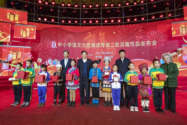 2018年12月23日下午,中央廣播電視總臺、教育部、國家語委聯合舉辦“中小學語文示范誦讀庫”第二季作品發(fā)布會。中宣部副部長、中央廣播電視總臺臺長慎海雄,教育部副部長、國家語委主任杜占元,中央廣播電視總臺副臺長閻曉明出席發(fā)布會,并共同見證第二批100篇音頻教材正式上線發(fā)布。新華社記者沈伯韓 攝