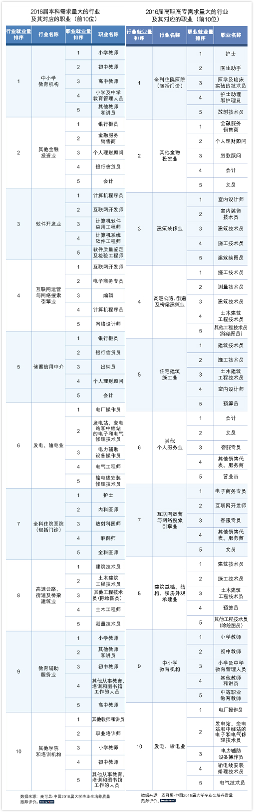 記者根據(jù)調(diào)查數(shù)據(jù)了解到,在對(duì)本科和高職高專畢業(yè)生需求量最大的前十個(gè)行業(yè)中,有六個(gè)行業(yè)是重合的,包括:“中小學(xué)教育機(jī)構(gòu)”“其他金融投資業(yè)”“互聯(lián)網(wǎng)運(yùn)營(yíng)與網(wǎng)絡(luò)搜索引擎業(yè)”“發(fā)電、輸電業(yè)”“全科住院醫(yī)院(包括門診)”“高速公路、街道及橋梁建筑業(yè)”?梢(jiàn)高職高專和本科需求量較大的行業(yè)存在一定的一致性。