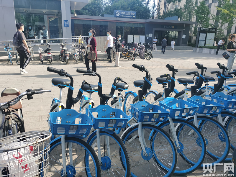 北京地鐵7號線達(dá)官營站前擺放整齊的共享單車(央廣網(wǎng)記者 劉一荻 攝)