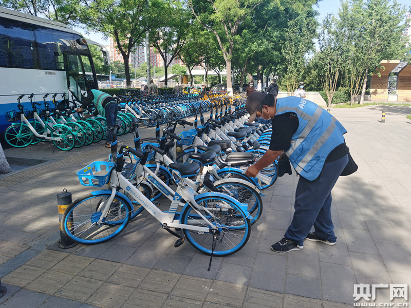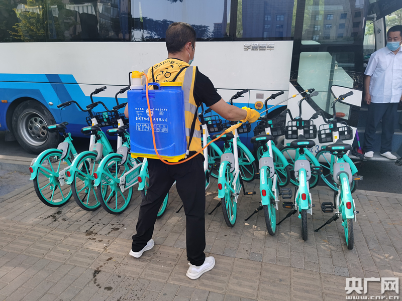 工作人員正在給共享單車進(jìn)行重點(diǎn)局部消毒(央廣網(wǎng)記者 劉一荻 攝)