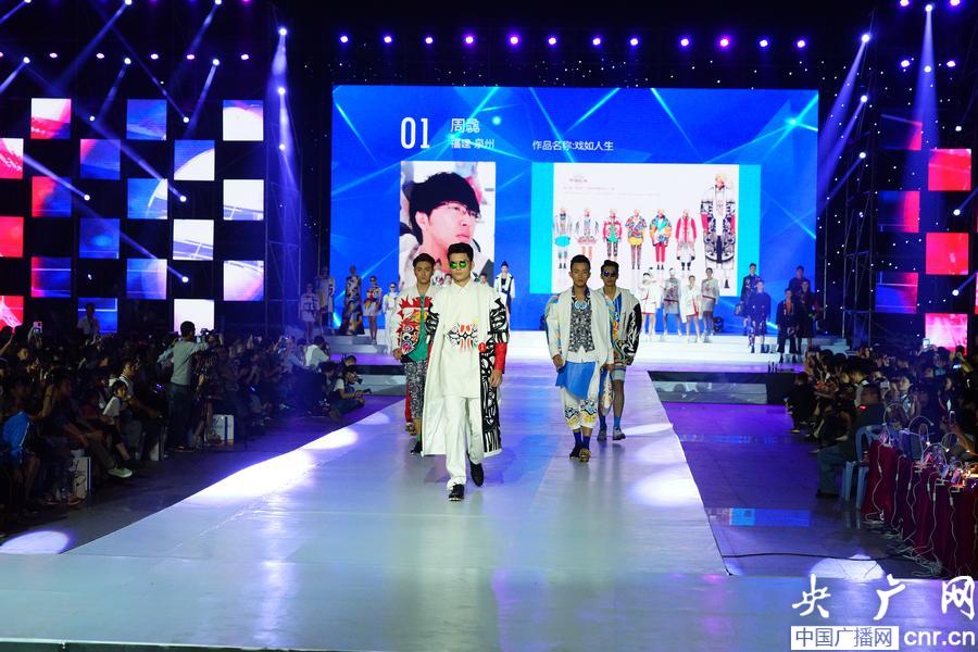 第二屆“園洲杯”全國休閑服裝設計大賽金獎1號周骉作品《戲如人生》(組委會提供)(央廣網(wǎng)記者 何偉奇 攝)