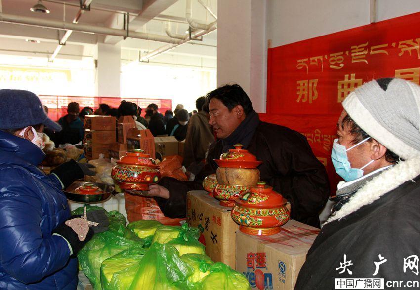 來自那曲地區(qū)羅馬鎮(zhèn)的商戶吉正在出售自家的畜產(chǎn)品(央廣網(wǎng)記者 普布次仁 攝)
