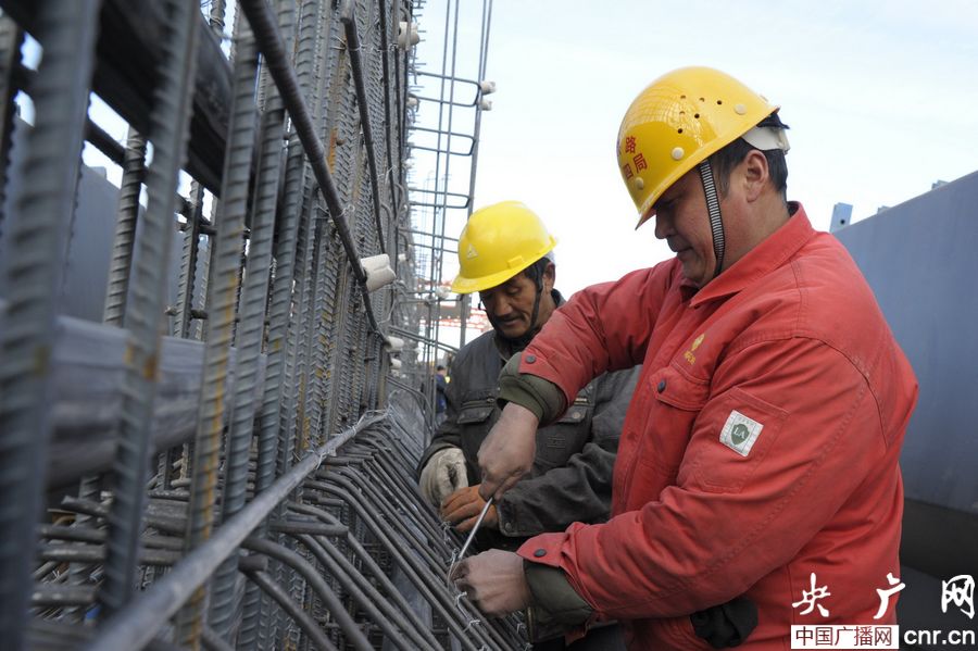 額(額濟(jì)納)哈(哈密)鐵路建設(shè)中鐵十四局額濟(jì)納鋪架基地,工人們正按照標(biāo)準(zhǔn)緊張進(jìn)行橋梁鋼筋捆綁作業(yè)。