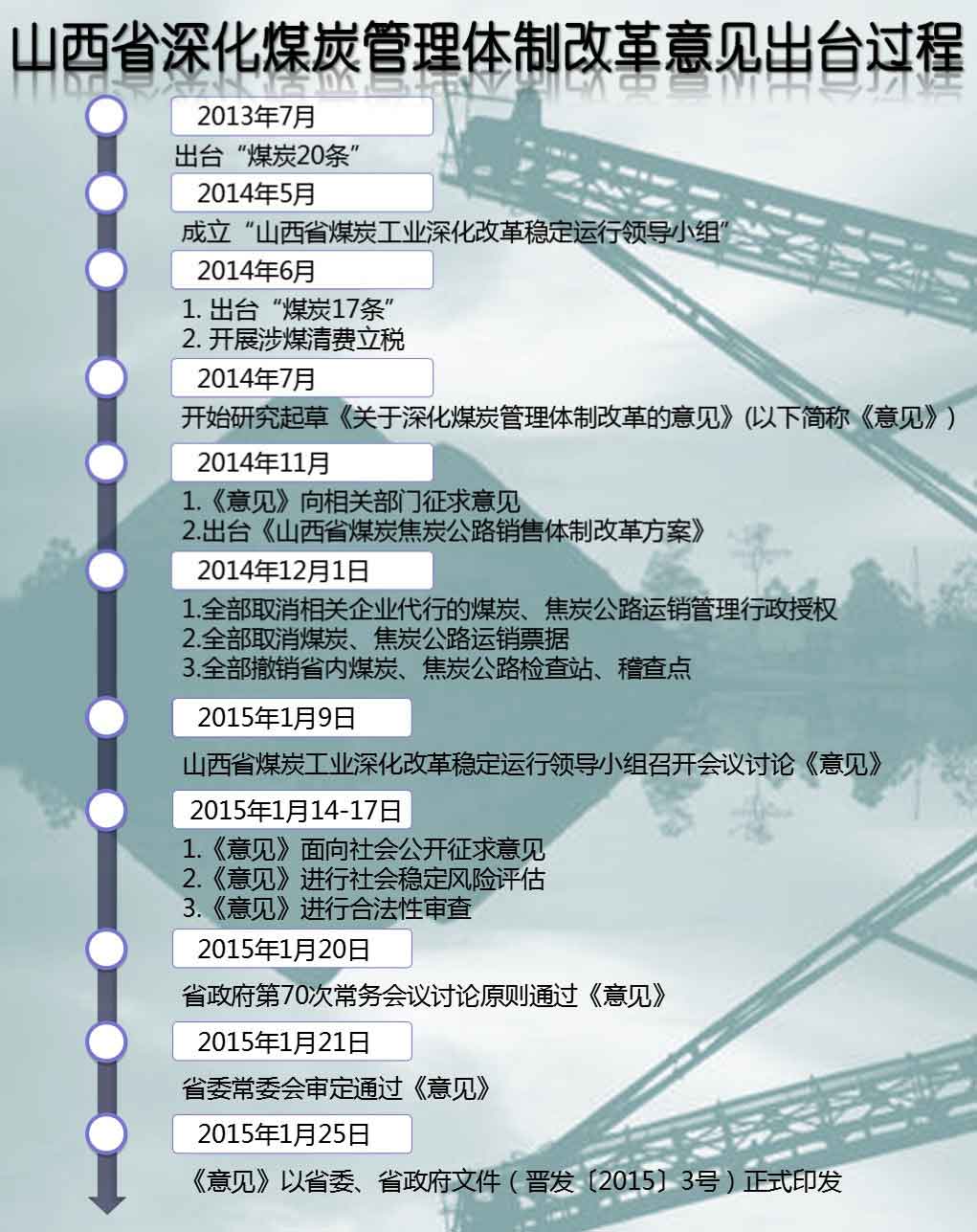 6.進(jìn)一步推進(jìn)煤焦公路運(yùn)銷管理體制改革。在取消所有運(yùn)銷票據(jù)和稽查站點(diǎn)后,要在2015年底前建成新的煤炭監(jiān)管信息平臺(tái)。
