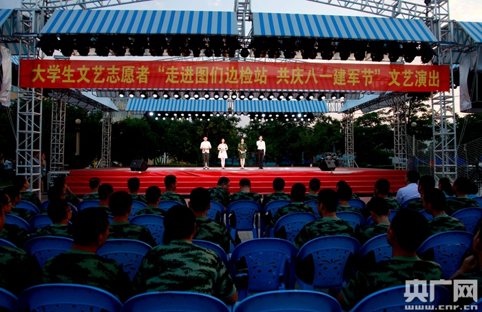 央廣網(wǎng)圖們8月1日消息(記者晁向榮 通訊員張彪)7月31日晚,大學(xué)生文藝志愿者“走進(jìn)圖們邊檢站 共慶八一建軍節(jié)”文藝演出在吉林省圖們市的圖們江廣場隆重舉行。來自甘肅中醫(yī)藥大學(xué)、大連理工大學(xué)以及西安建筑科技大學(xué)的30名大學(xué)生文藝志愿者為官兵們奉上一場精彩的演出,圖們邊檢站、延邊邊防支隊(duì)機(jī)動大隊(duì)二中隊(duì)官兵及駐地群眾共計(jì)500余人觀看演出。