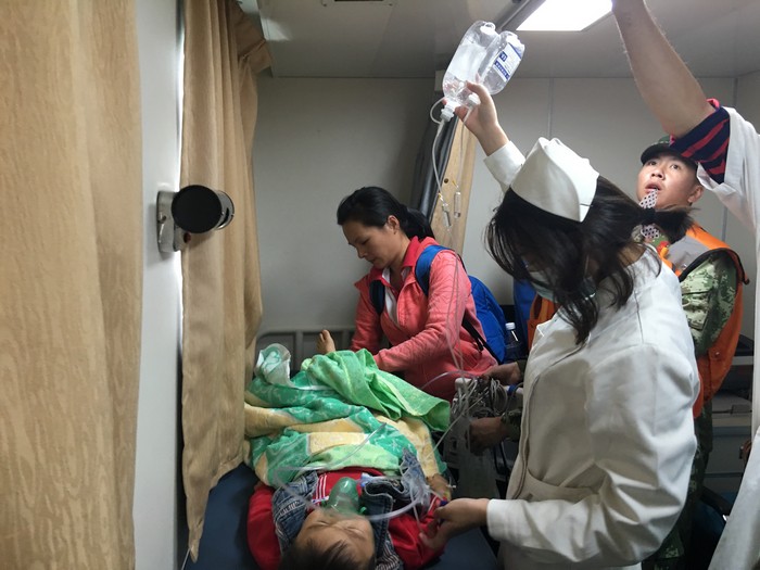 10時(shí)10分許,海警45001艇從北海全速向潿洲島駛?cè)ィ?1時(shí)10分到達(dá)潿洲島客運(yùn)碼頭。船剛一停穩(wěn),幾名官兵就沖上碼頭,與醫(yī)護(hù)人員一同將受傷兒童護(hù)送上艇。