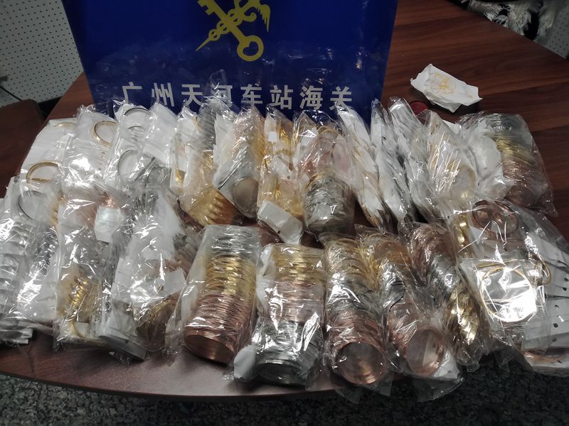 11月25日上午,天河車(chē)站海關(guān)關(guān)員在一名出境旅客隨身行李中查獲未向海關(guān)申報(bào)的“Cattier”、“Hermes”、“Chanel”、“Gucci”等知名品牌的手鐲,這批手鐲做工低劣,包裝簡(jiǎn)陋,共計(jì)482件,涉嫌侵犯卡地亞、愛(ài)馬仕、香奈兒、古馳等8個(gè)知名品牌的知識(shí)產(chǎn)權(quán)。據(jù)當(dāng)事人稱,該批手鐲總價(jià)僅3800元,無(wú)法提供相關(guān)知識(shí)產(chǎn)權(quán)證明。