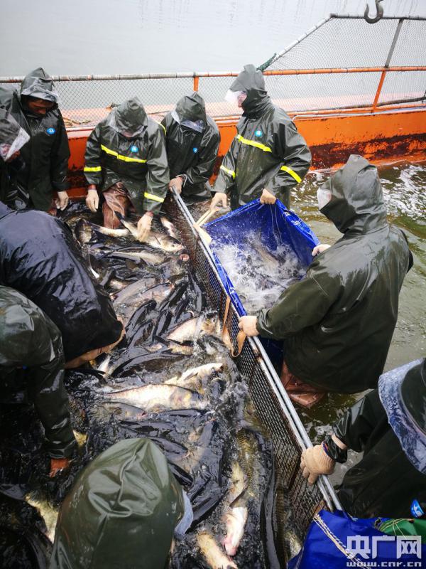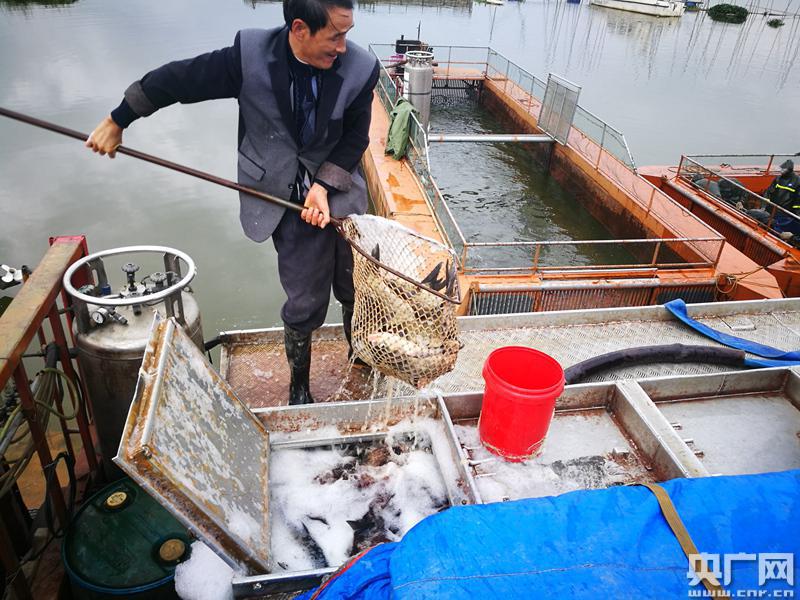 他說:“這個是白鰱,是吃浮游植物的,這個黑一點(diǎn)的是吃浮游動物的。這邊有個閘門,可以直接放水,直接用湖里面的水就可以直接把魚運(yùn)出來,利用了潛水艇的原理,靠的是浮力,底下全部布滿了氧氣管!