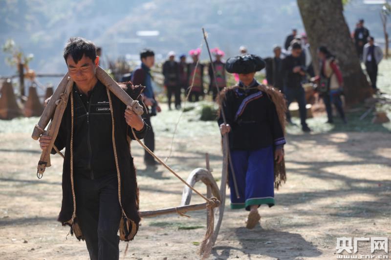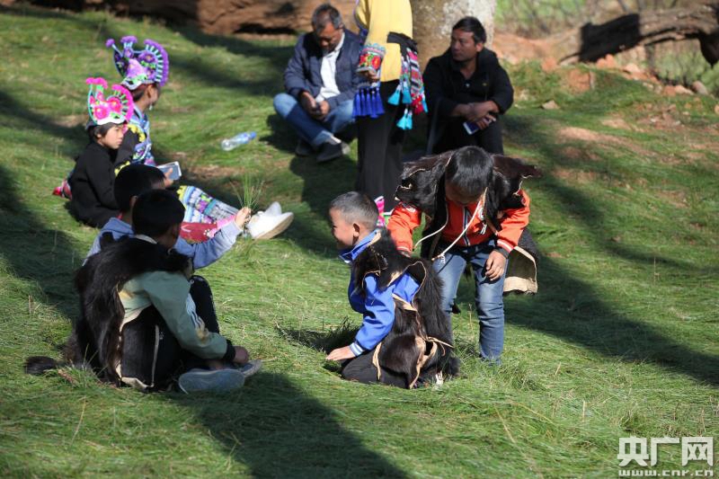 賽裝節(jié)一開始就有比賽的性質(zhì),這可謂是最早的時裝表演,更是表演中的“時裝模特”。在畢摩老人為賽裝節(jié)順利舉行完虔誠的祭祀后,各年齡層次的賽裝隊伍手挽手在蘆笙的伴奏中依次上場。