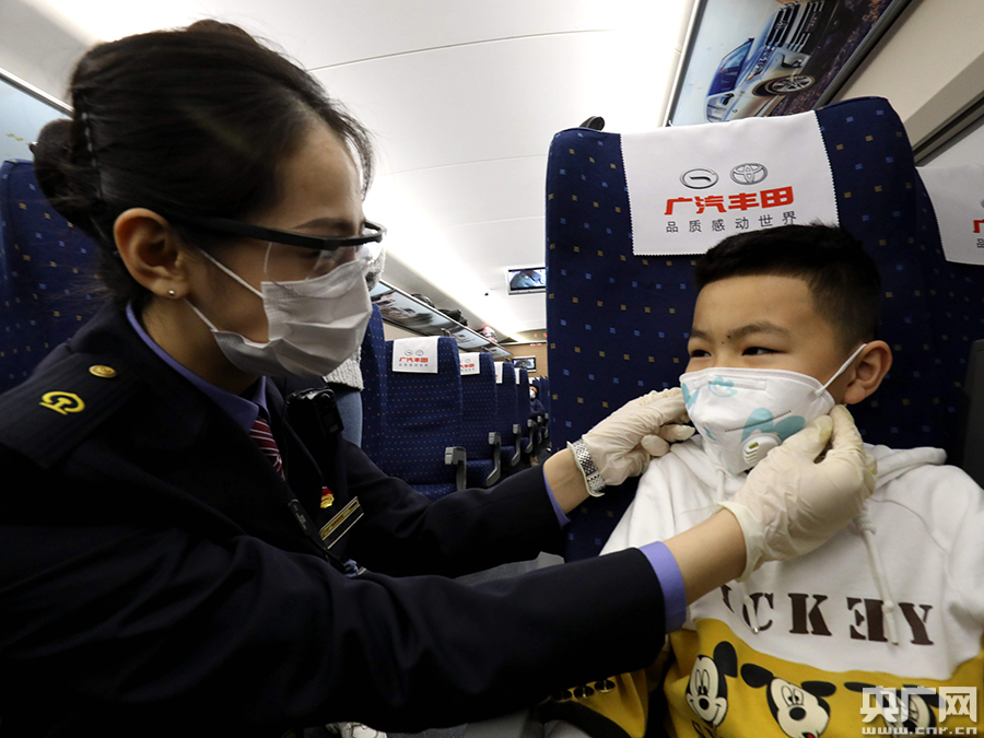 乘務(wù)員為小旅客整理口罩(央廣網(wǎng)發(fā) 通訊員張貴鋒 攝)